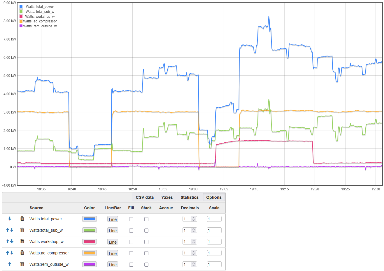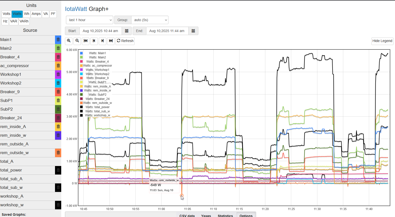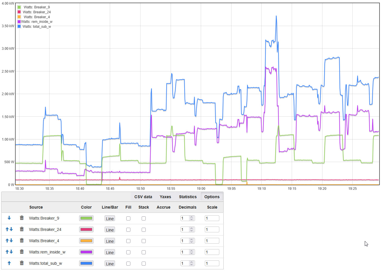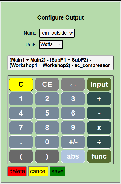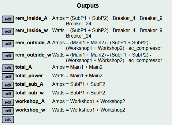 I have a main panel below the meter, a sub panel inside the house and a sub panel on my workshop. I don’t have all the breakers monitored so I tried to set up some outputs to collect stats on the “untracked” breakers.