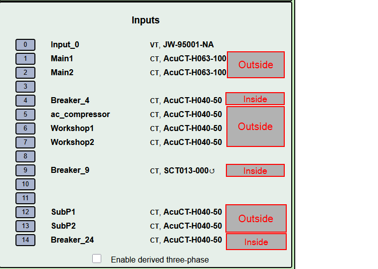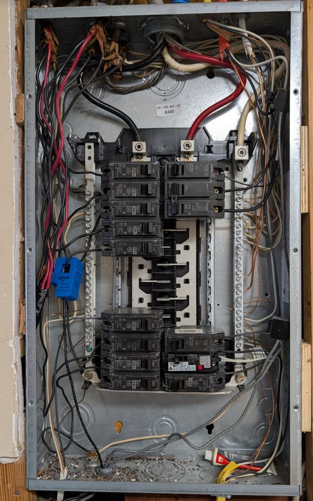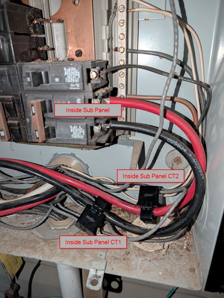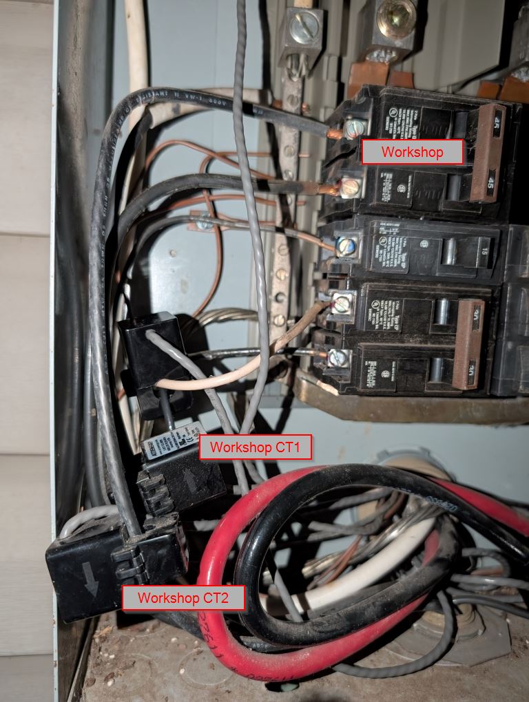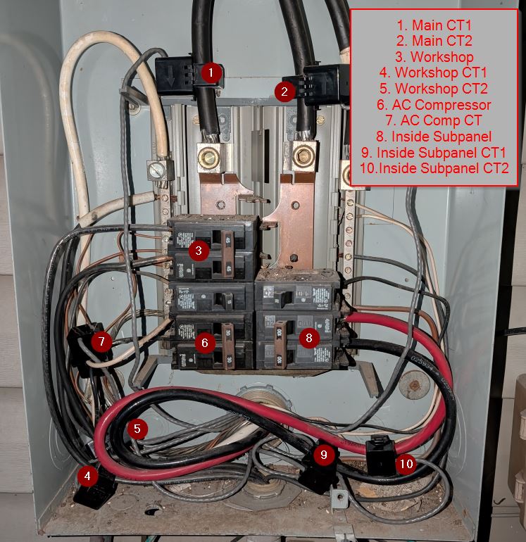 In the main panel I have two CT’s for all usage from the meter, two CT’s for the workshop, two CT’s for the inside subpanel and one CT for the AC compressor right next to the panel.