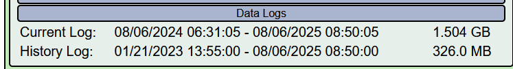Got/installed mine in Jan 2023… and has been running since then. You can see the Current Log has a year’s worth at 1.504GB up to today. The History Log is only 326MB after 2+ years so it hasn’t started overwriting yet.