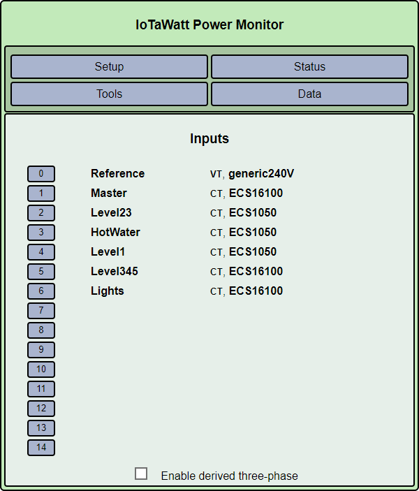 There are seven breakers in addition to the main, which you say is the red one on the left. You are monitoring five. What is going on with the other two? I can see that one is the three-phase breaker that appears to have only a neutral wire running through it. Why is that on? If that neutral were carrying current, I would expect the breaker to trip on a ground fault. What’s going on with the one next to the main? It has a fat red wire that doesn’t seem to be part of the regular picture. I realize any power they would draw would make spread worse, but knowing them could also make the problem obvious. Can you show a screenshot of the status display with the unmeasured breakers off?